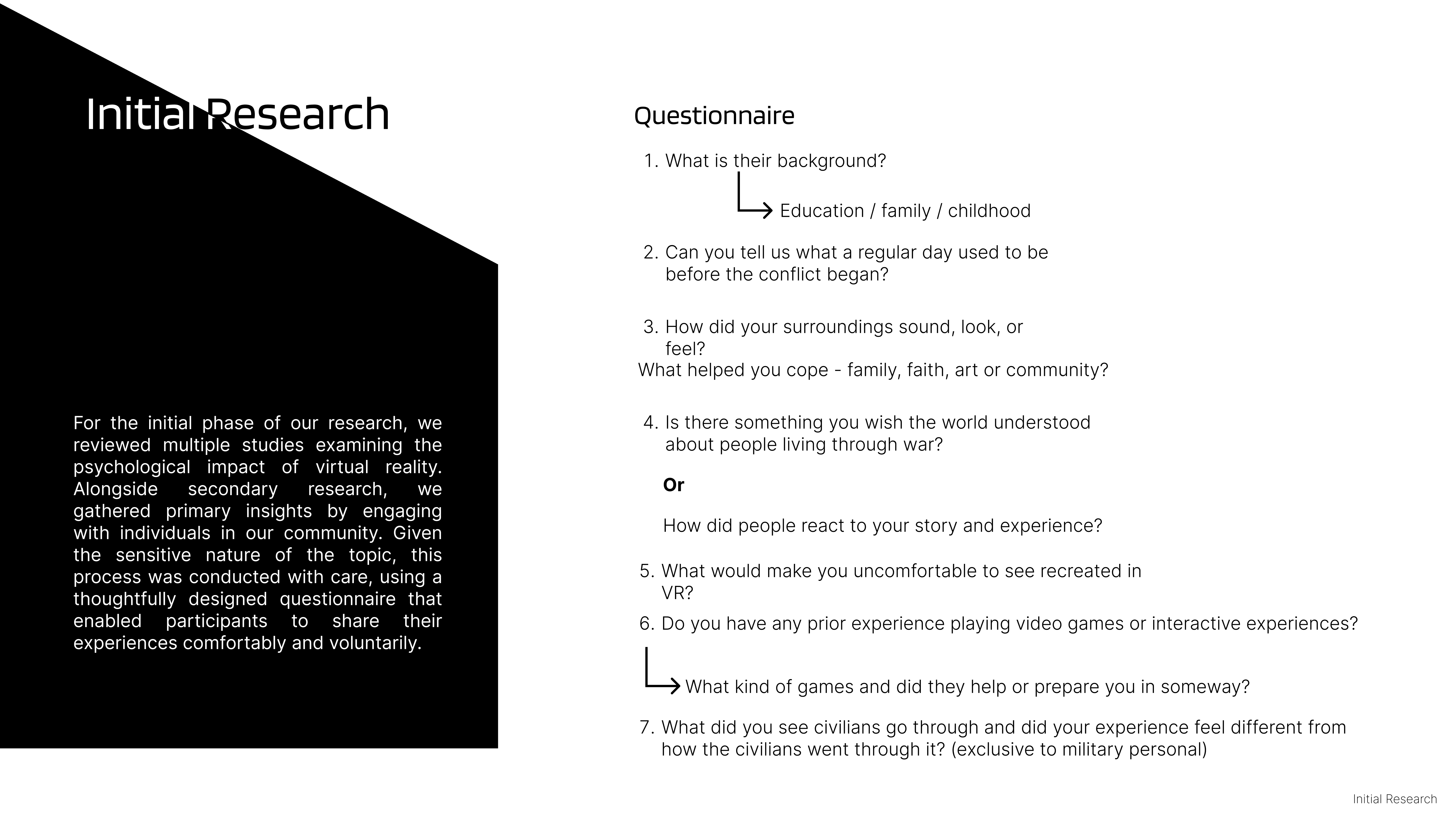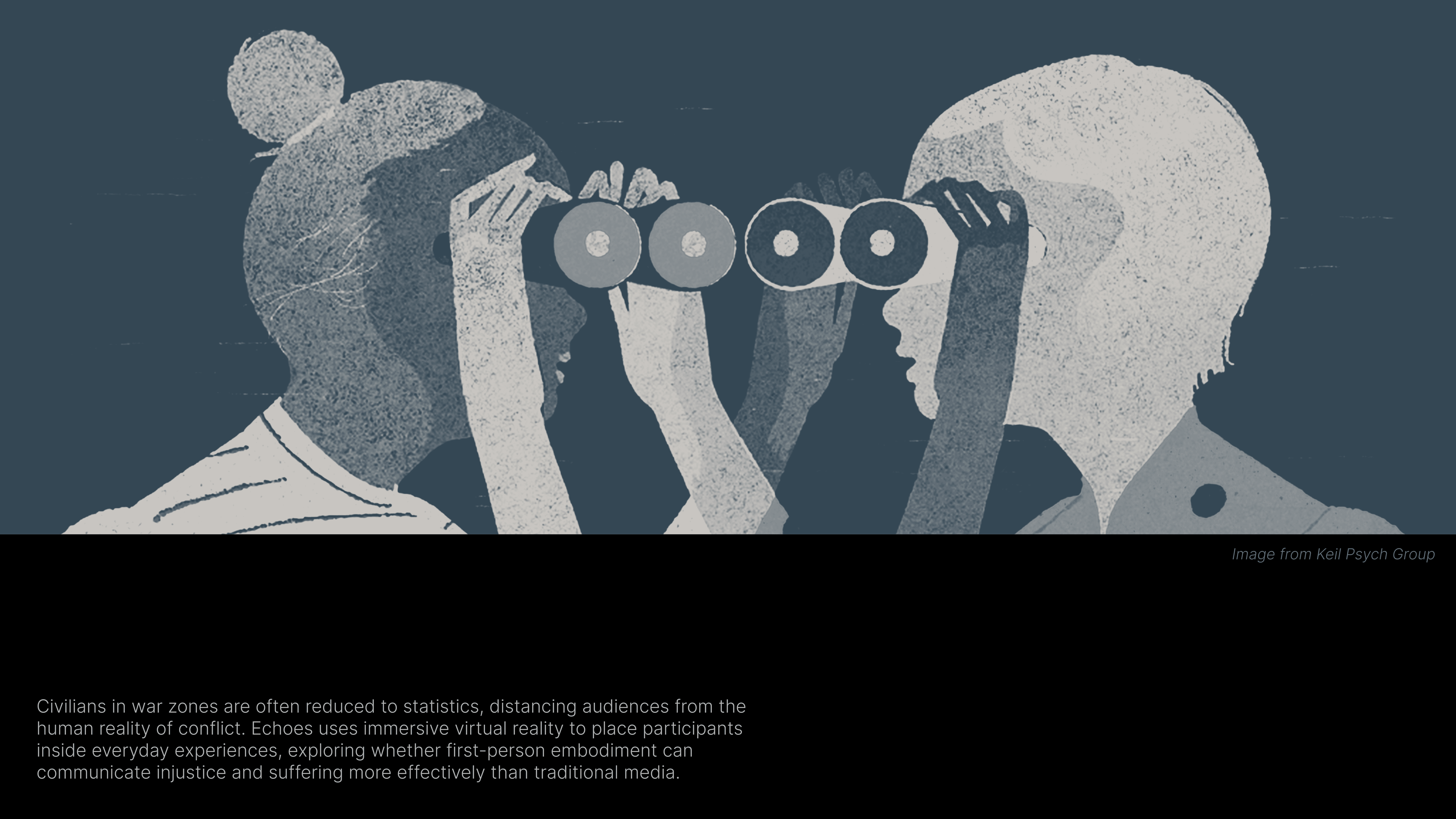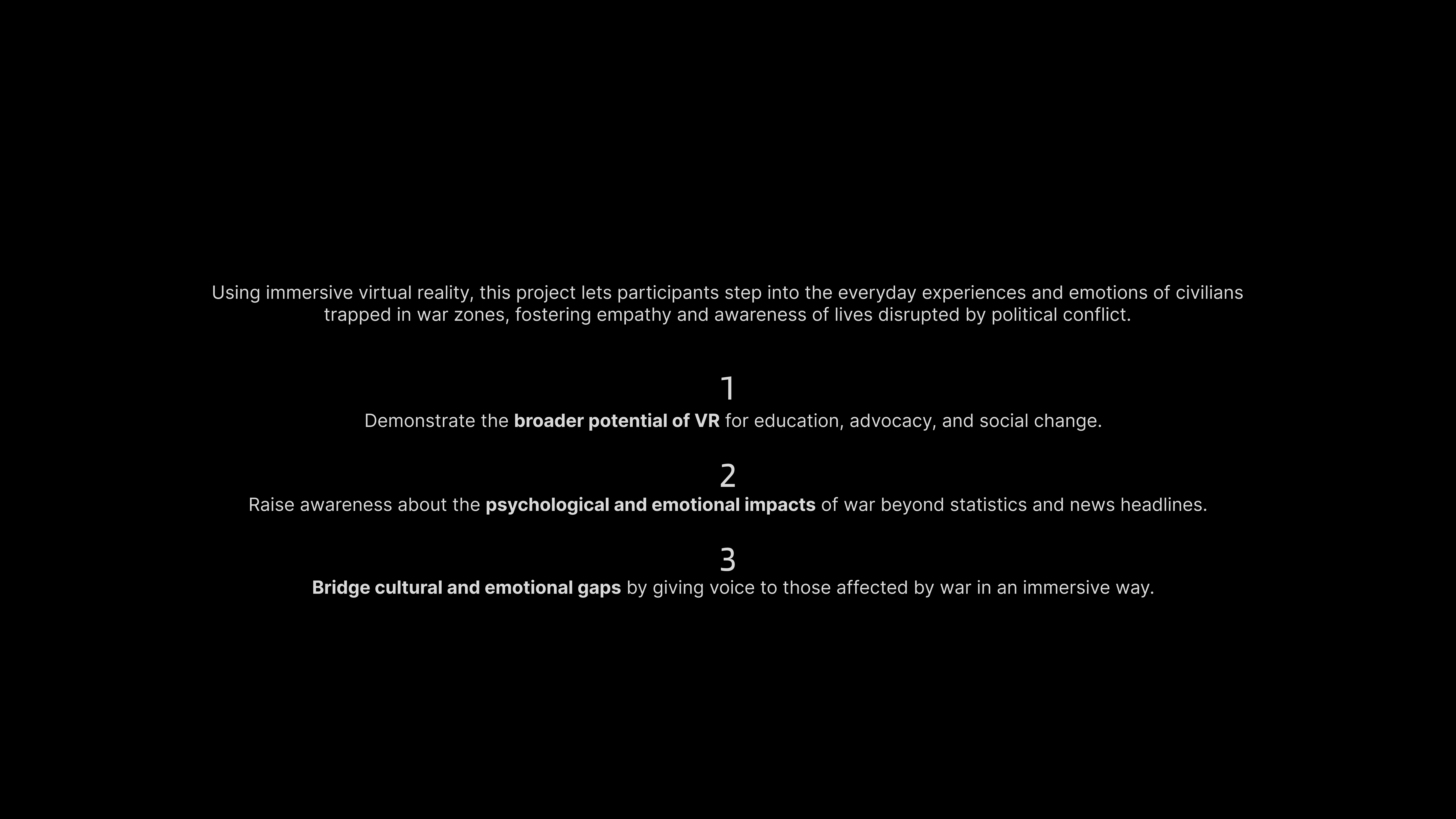 Using immersive virtual reality, this project lets participants step into the everyday experiences and emotions of civilians trapped in war zones, fostering empathy and awareness of lives disrupted by political conflict.